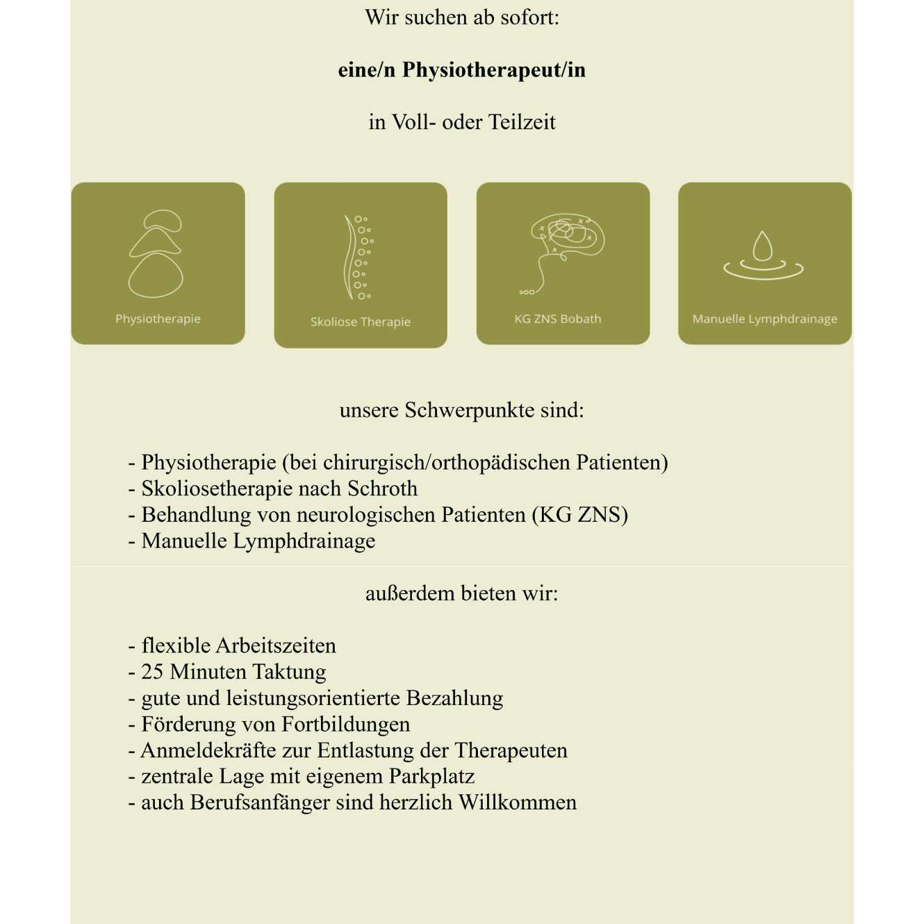 Hier findest Du alle akutellen Stellenanzeigen unserer Praxis. Unser Team arbeitet kollegial und respektvoll zusammen. Durch interdisziplinären Austausch gestalten wir individuelle Therapien mit Fokus auf Empathie und Vertrauen. Dabei fördern wir die aktive Erholung unserer Patientinnen und Patienten und begleiten sie auf ihrem Weg zu mehr Wohlbefinden.